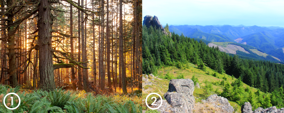 Pobřežní douglaskový les na ostrově Vancouver (1) a horský douglaskový les ve Washingtonu (2)