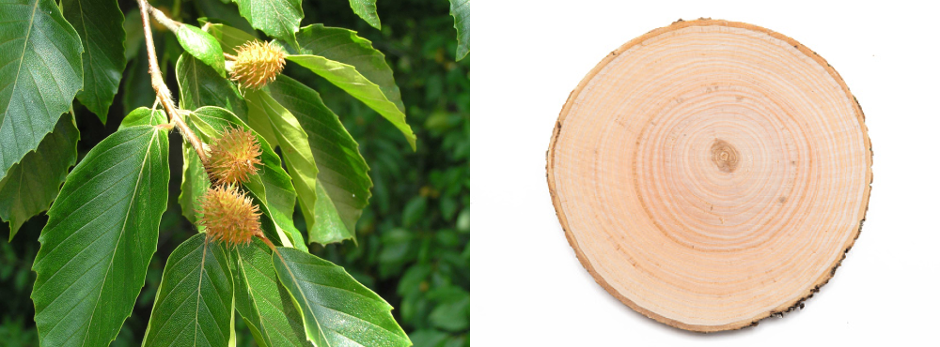 Leaves and fruits of Beech tree and Cross-section of Beech wood