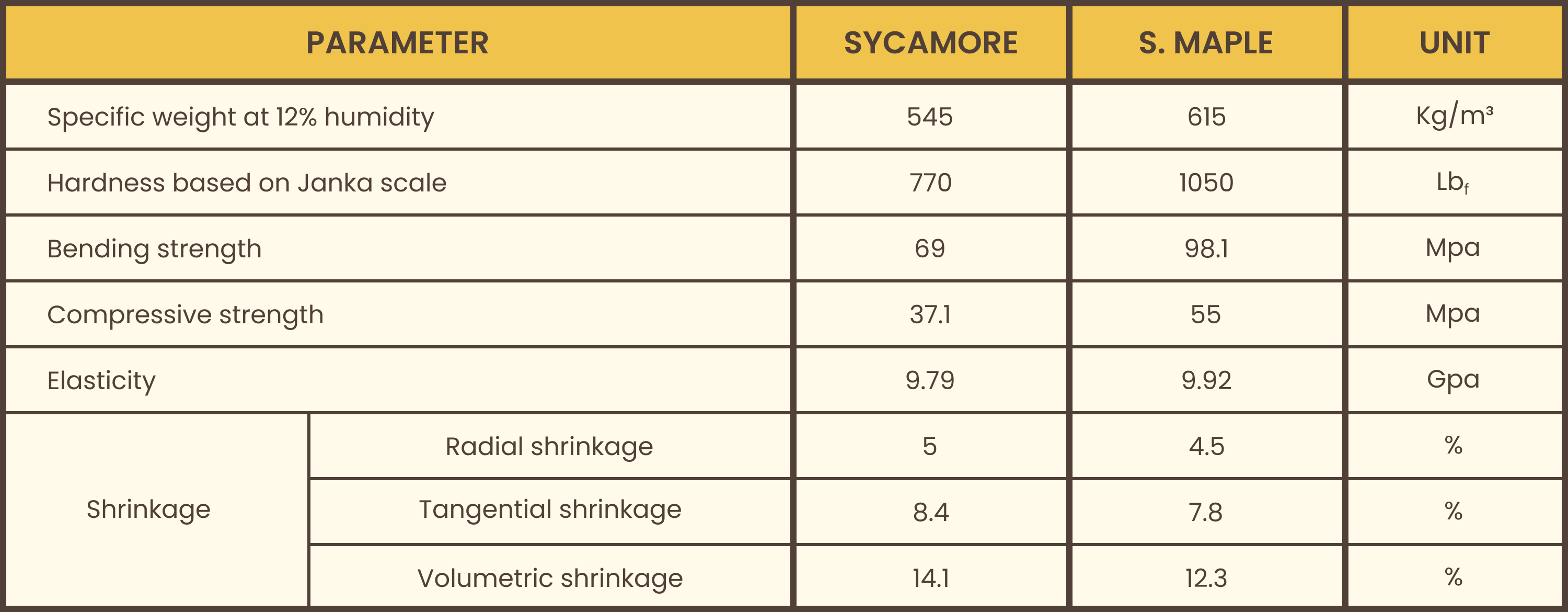 The parameters of Sycamore Maple are pretty regular; its density, hardness, and elasticity are all quite good.